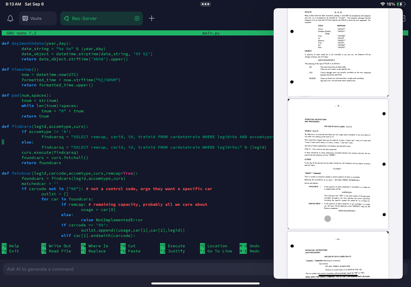 My very real development environment for the MVP. Shout out to Termius, though I wish I could get rid of the AI prompt at the bottom, given that it was entirely useless for this process.